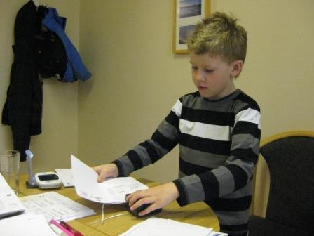 Idag har Anton varit med mig på jobbet. Han kunde vara hos mormor eller Wilmer idag men han skulle prompt med mig på jobbet. På jobbet har jag en elektrisk brevöppnare…… det var den som lockade. Han tycker det är så kul att öppna posten. Det är ju skärtorsdag idag så jag slutade kl 12:00 och då går det bra att han är med. Malin valde att vara hos mormor och morfar. Dom tog en promenad med Zune och bakade sedan negerbollar.