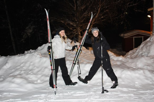 Malin har varit till tandläkaren och fått nån ny fjäder på tandställningen. Malins kompis Emma sover här inatt och helt plötsligt fick dom för sig att dom skulle ut och åka skidor. Malins lite korta skidor hade Anton kvar på skolan så dom plockade fram dom långa skidorna och pjäxor i strl 43 😮 Dom stoppade tidningspapper fram i tårna och sen drog dom ut i spåret. Man tager vad man haver 🙂