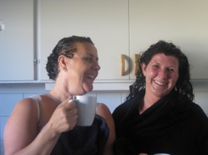 Drog till Git och färgade håret, jag på henne och hon på mig. Nån hårfrisörska blir hon aldrig… När hon häft i all färg i håret liksom gnussar hon runt all färg. Bara sliter i håret och jag skriker När hon sen ska dra undan mitt långa hår från kinderna drar hon med handskarna full i färg efter kinden. Panik! Vill ju inte vara brunfläckig i hela ansiktet *fniss*