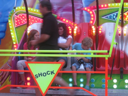 Malin ville åka ”Shock” med mig en gång till och jag gjorde det. Jag blåhöll ju hela turen så jag nästan hade ont i händerna men när karusellen saktade ner släppte jag. Karusellkillen såg det och så fort jag släppte drog han på fullt igen. Där satt han med ett flin på läpparna och hade nog väldigt roligt åt mig 🙂