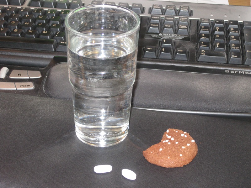 Alvedon har en förmåga att lösa upp sig innan jag hunnit svälja därav kakan. Jag tuggar den tills det bara är att svälja och stoppar snabbt in tabletterna så dom slinker ner med kakan och sen skölj med vatten. Smart drag!