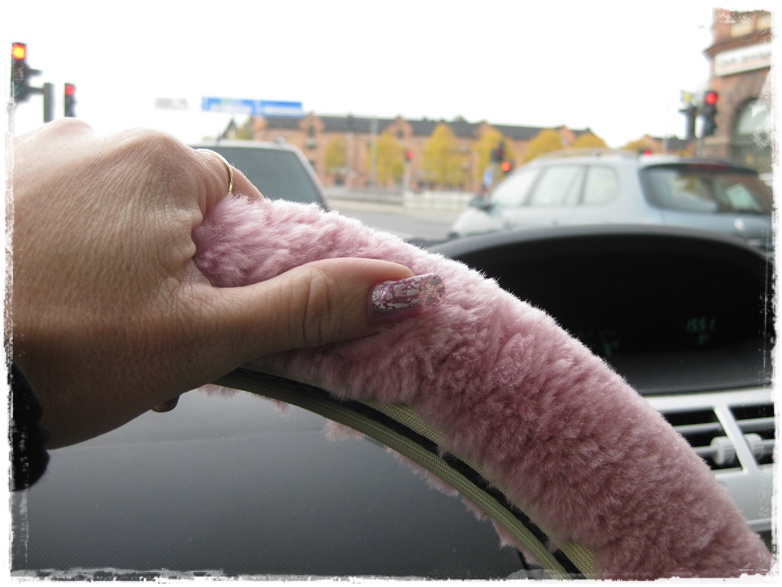 Imorse var det kallt, riktigt kallt. Jag krafsade fram min rattmuff från skuffen och nu sitter den där så rosa och fin 🙂