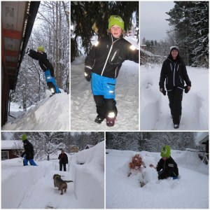 Anton och jag har varit i Järvsta. Pappa och jag skottade tak, det var 70 cm där det var som djupast. Det var svettigt men gick ganska fort ändå, man får se det som ett träningspass 😛