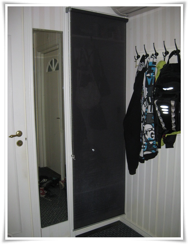 Köpte en rullgardin till den öppna garderoben i hallen. Bara att dra ner så slipper man se alla skor som ligger i en enda röra därinne. Nu tror jag inte Tex tyckte idén var lika briljant när han skulle sätta upp den men efter mycket trixande sitter den på plats.