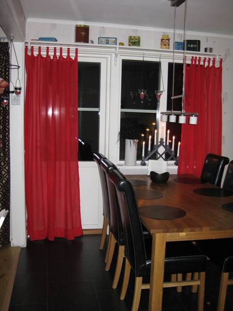 Efter en tillbakablick i bloggen köpte jag de helröda gardinerna förra året och jag var inte helt nöjd då heller. Då resonerade jag att dom får duga eftersom dom bara ska sitta i några veckor och JA dom får duga i år också. Imorgon åker dom upp 😛