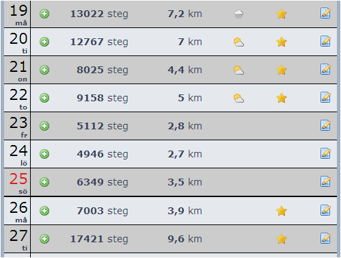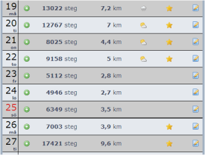 Med de sista proppade dagarna har stegen blivit lidande. Från att ha ett snitt på drygt 10000 steg per dag är jag nu nere på 9861 steg. Går jag inte lunchprommisen så hinner jag faktiskt inte komma upp i speciellt många steg 😦
