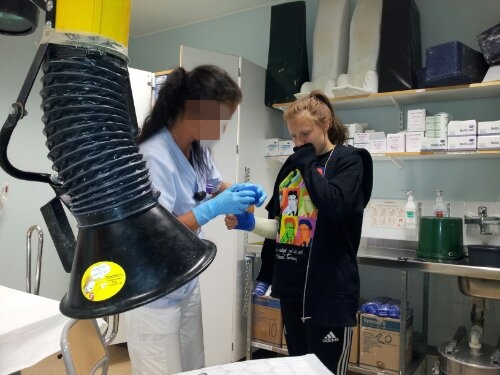 Fick röntga på 3 röda och blev sedan skickad ner på akuten igen. Väntade ca en timme och fick sedan träffa en läkare som sa att Malin har en spricka i handleden. KUL! Vi åker till Turkiet på tisdag 😦