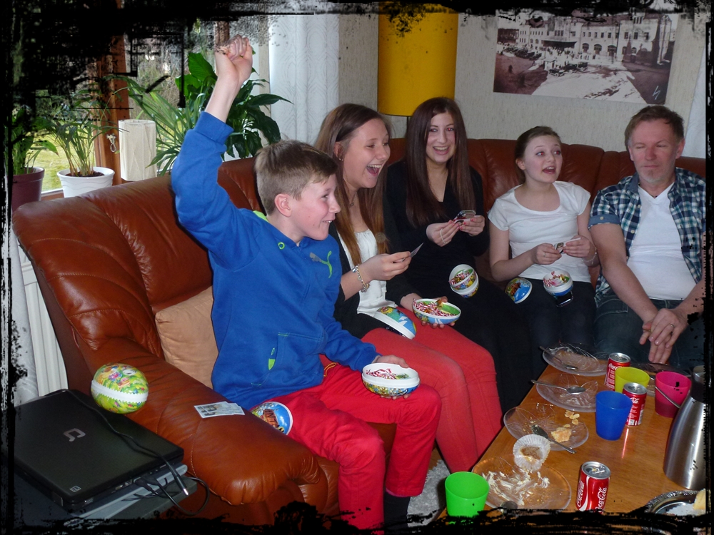 Barnen, alltså våra barn och mamma och pappas barn fick varsitt påskägg = Lena, jag och våra 4 barn.