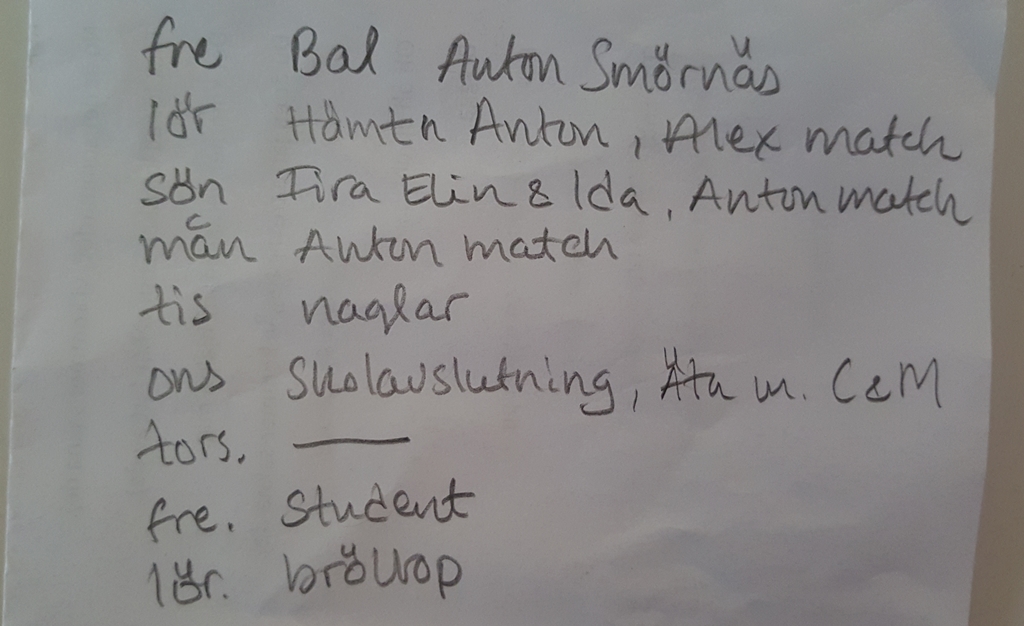 Jag var tvungen att skriva ner på papper vad som är på tapeten närmaste veckan och lite till.
