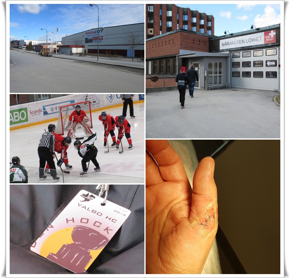 Tex kom upp på läkaren med tummen inlindad i papper och INGEN trodde honom fast samtidigt var det lite konstigt att han kom mitt i matchen. Han behövde verkligen sys 😮 Han skar sig på en skridsko i tummen.