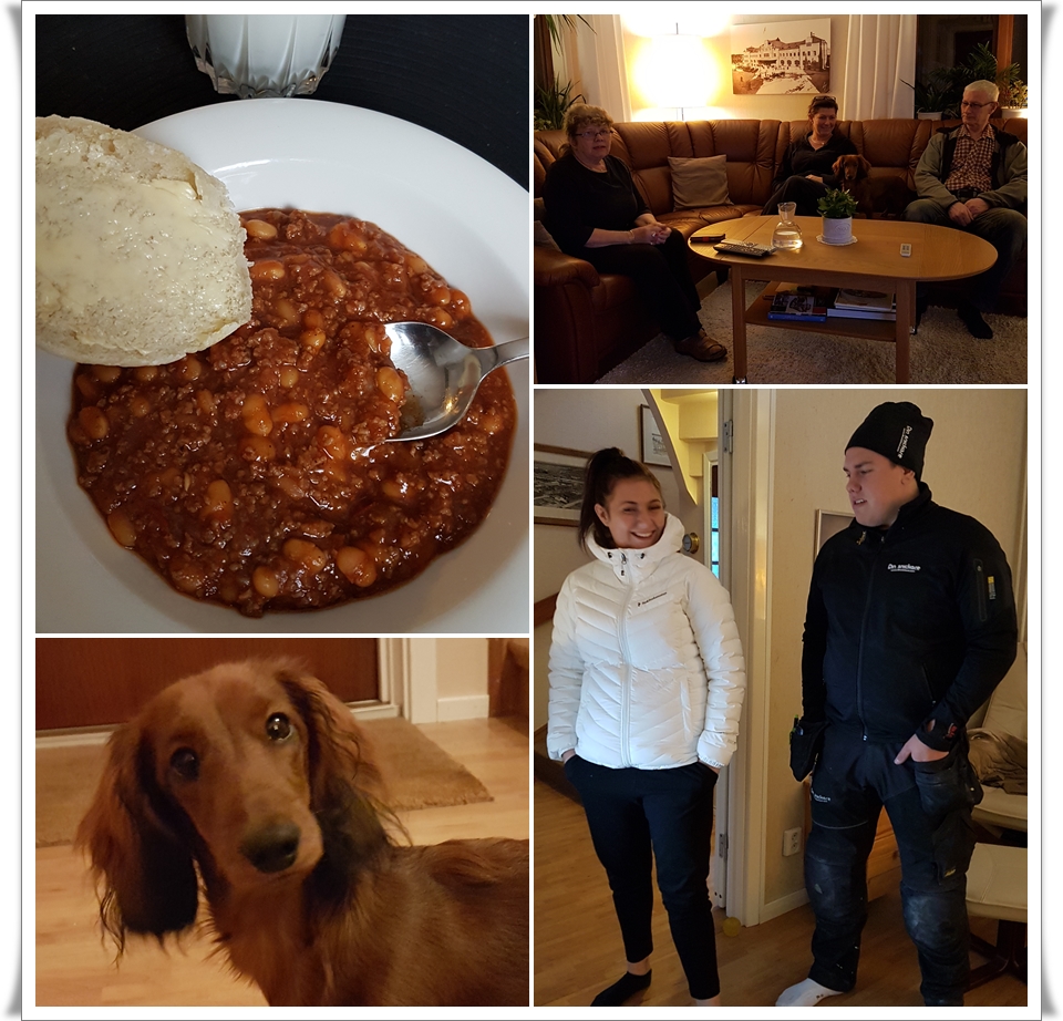 Tex och Anton har varit i Ludvika på målvaktsdag så jag fick äta frulle i min ensamhet. Åkte till mamma och pappa. Prickade lagom in lunchen, Chili con carne med hembakat fralla. Kan tänkas att det var lite uträknat att komma precis till lunch 😋