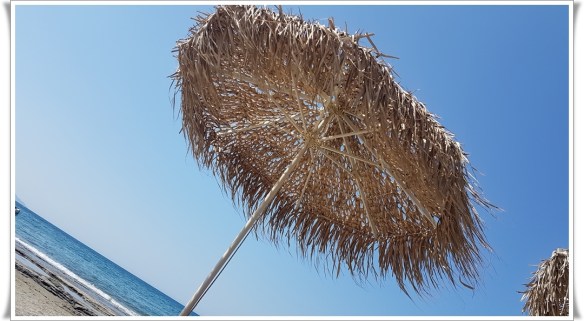 Vi ligger som strandade sälar under parasoll, fantastiskt skönt! 🌞