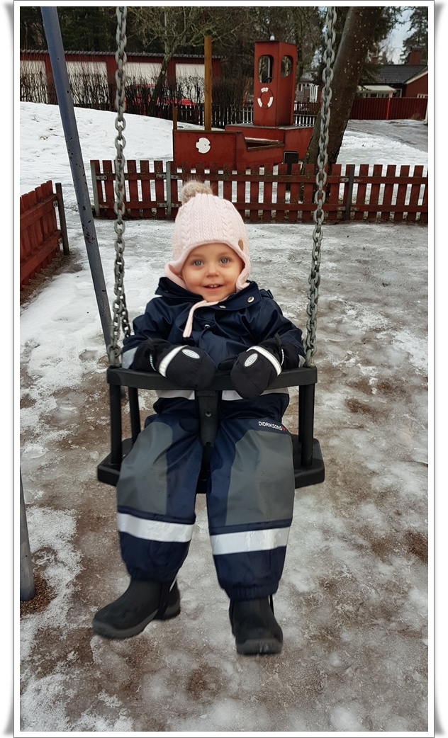 Ledig dag och vid lunch kom Milly. Den tjejen kan gunga, läääänge. Hade full sjå att ta oss ut till lekparken utan att drutta på rumpan. Isbana överallt men väl där gungade och sjöng vi i nästan en timme.