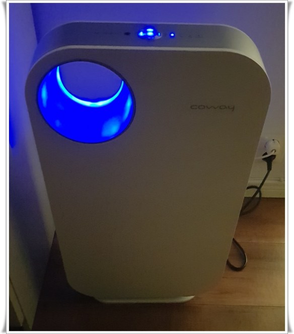 Den har i alla fall stått i sovrummet hela natten. Den lyser blått ibland och ibland slocknar den. I morse när vi stökade runt började den lysa ljuslila. Ett tecken på att den fick jobba 😁 vi rörde väl runt allt damm för jag städade inte innan jag ställde dit den. Kanske måste damma av lite…..
