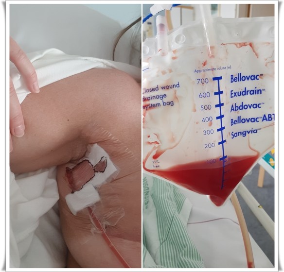 Så blev det morgon med frukost på sängen. Nytt blodtryck, puls och temp. Kirurgläkaren kom och tittade på såret och hur mycket sårvätska som kommit ut och det var inte mycket (enligt henne). Äckligt enligt min mening 😋 Det var alltså det här som kluckade och skvalpade efter förra op eftersom jag inte hade nåt dränage då.
