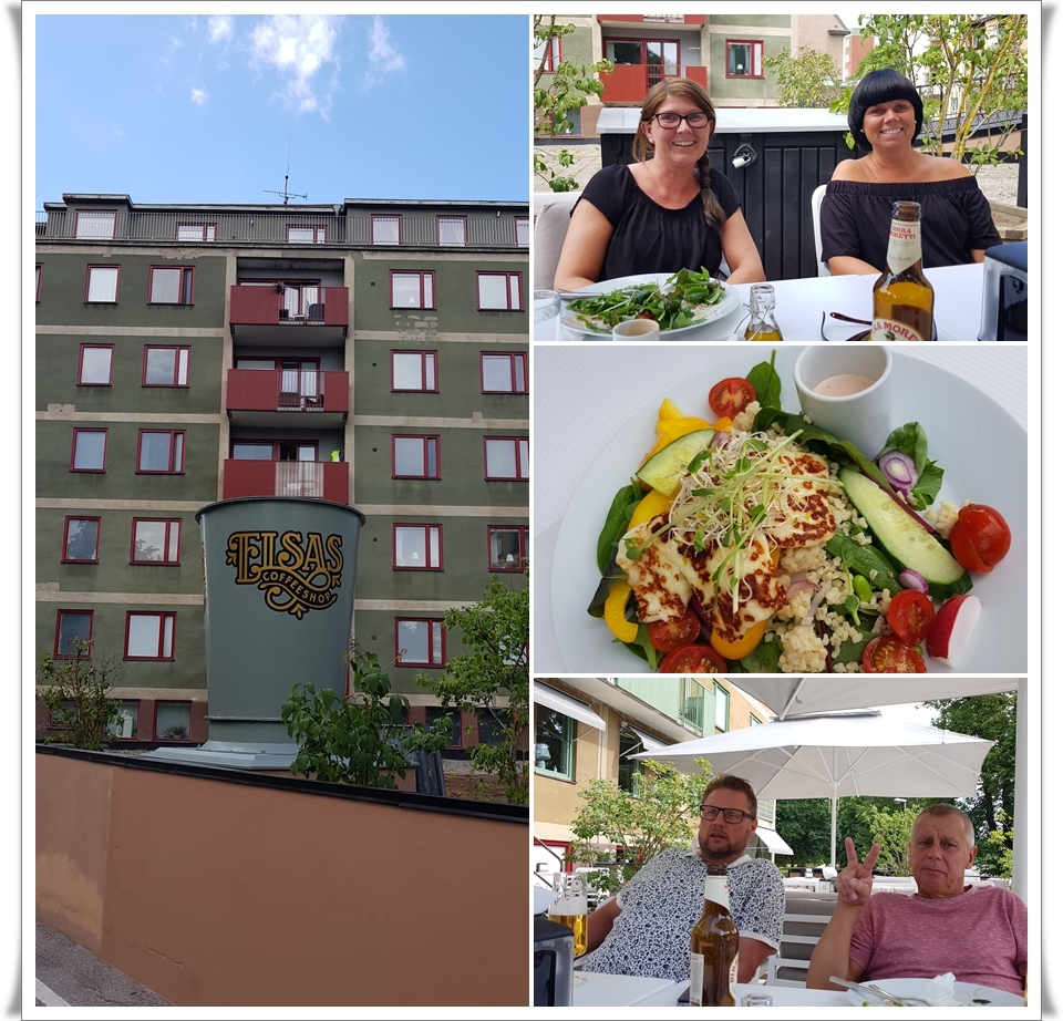 Vårt mål med cyklingen var i alla fall Elsas Café. Vi hittade ett bord i skuggan och åt haloumisallad och chokladkaka. Riktigt gott och trevligt så det var värt cykelturen 😋