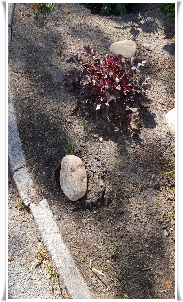 Börjar nästan tro att nån vill jävlas med mig. Man kan inte köra över rabatten 3 ggr!! Den här gången var det i alla fall stenen som fick ta smällen. Den vi la ut efter andra överkörningen…..