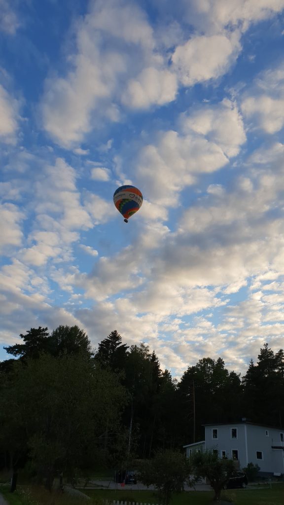 Vi såg en luftballong efter vägen. Jag har aldrig åkt luftballong och vet inte om jag skulle våga göra det heller.