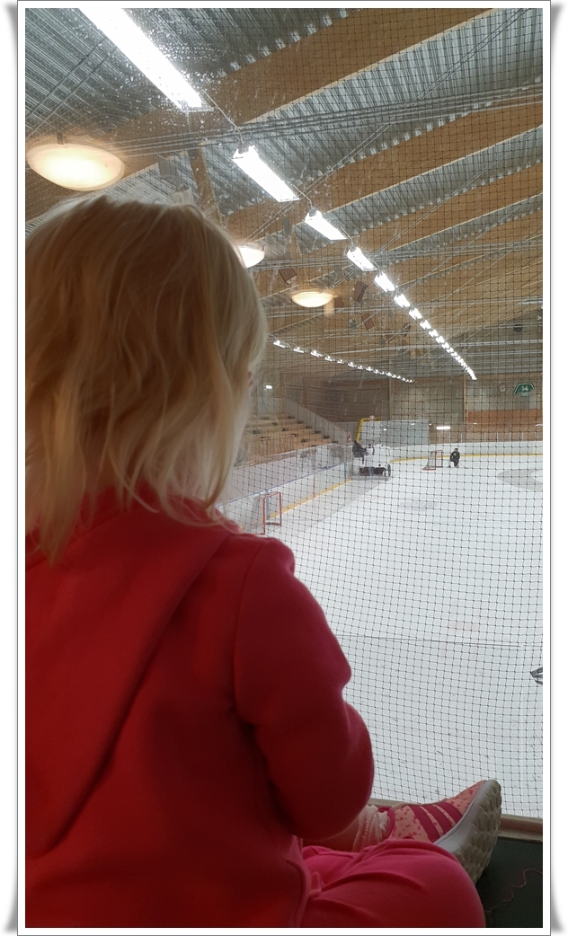 Men så skulle ju jag på yoga och då lämnade jag Milly på hallen så hon fick vara med farfar när Anton tränade. Jag hämtade henne efter yogan. Vi kunde inte åka hem förrän Antons träning var klar och ismaskinen hade spolat hela isen.