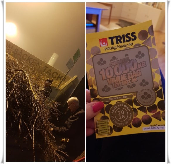 Jobbade på eftermiddan och åkte sen till Järvsta. Lena och jag hjälpte pappa tömma en släpkärra trädgårdsavfall på Återvinningen. Går fort när man är 3. Lena och jag fick varsin trisslott och vi skrapade som i tv. Tränade liksom inför vår riktiga skrapning. Vi svarade jättebra på programledarnas frågor 😂