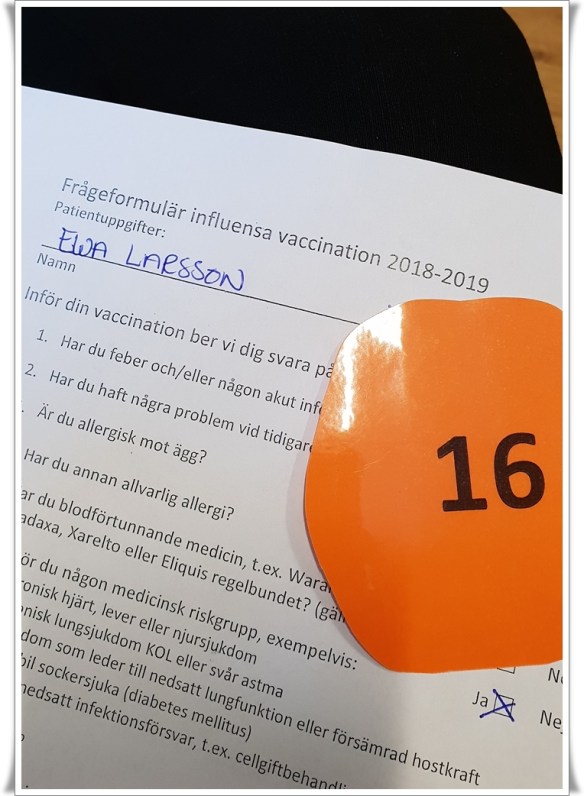Det var pensionärer, gravida och JAG 😊 Fick kölapp nr 16 och det gick verkligen på löpande band. Hann i princip bara fylla i min lapp så var det min tur. Sköterskan frågade varför jag var i riskgrupp och jag berättade att jag fått cellgifter. Hon tyckte det var jättebra att jag var där och konstaterade att jag då är van att bli stucken.
