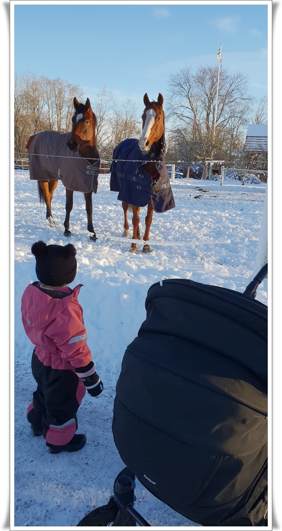 Tjejerna och jag tog en promenad och tittade på hästarna på andra sidan ån innan vi gick hem till lekparken och gungade. Så jättehärligt vinterväder.