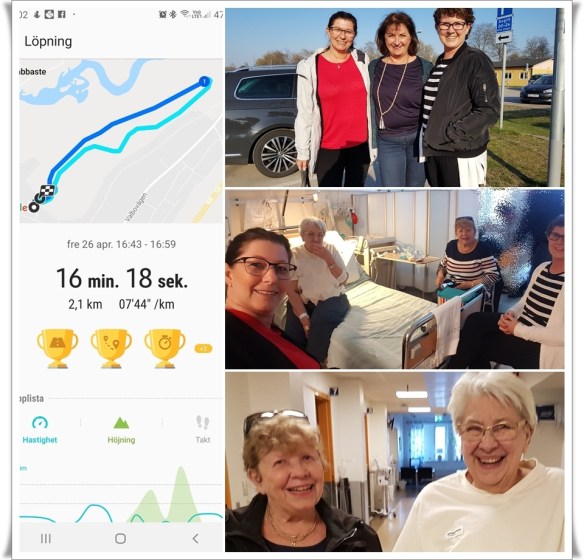 In i duschen och iväg till sjukhuset för att hälsa på min moster Magga som är lite krasslig. Träffade kusin Gilla på parkeringen innan vi gick in en omväg för att komma till rätt avdelning.