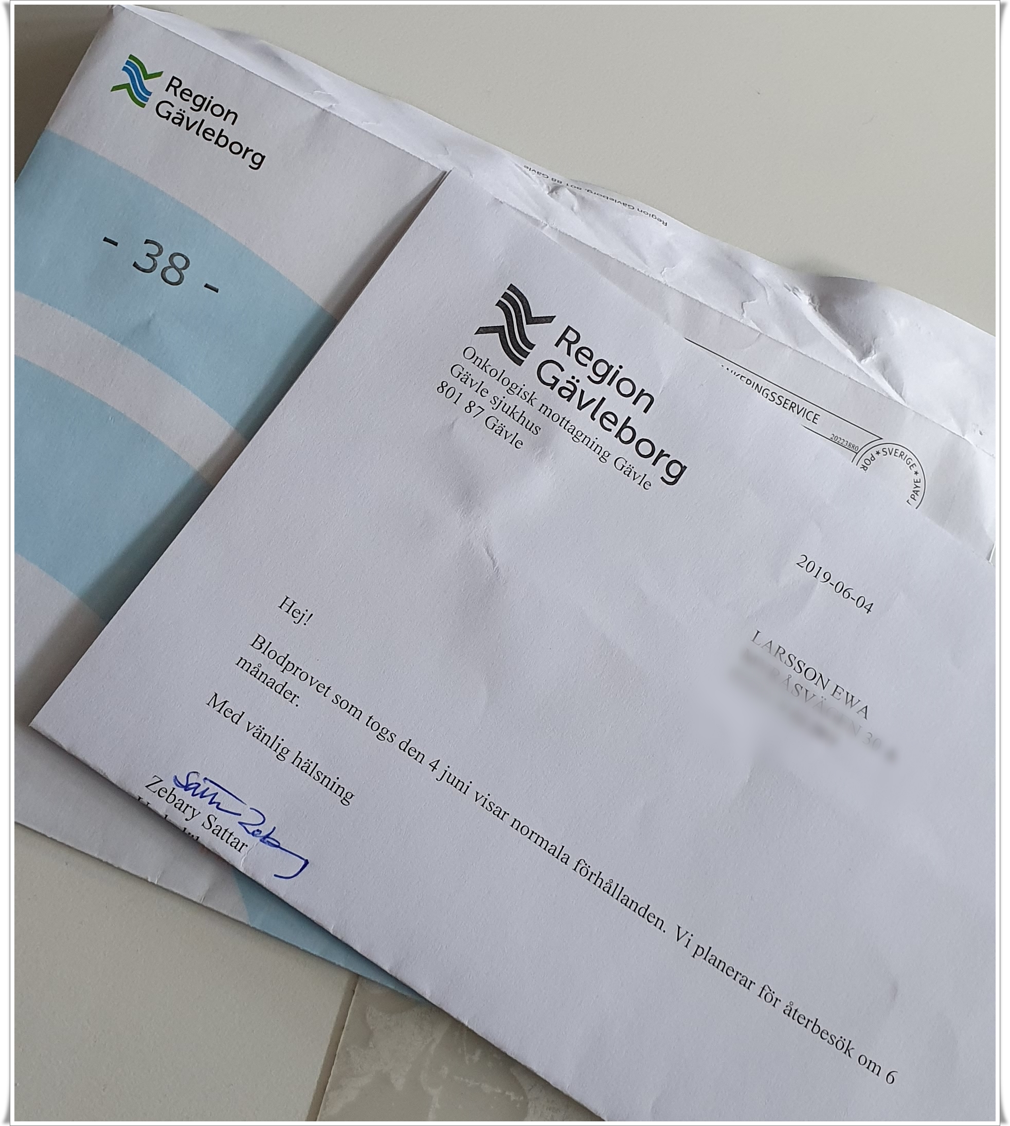 Idag låg ett brev på köksbordet…… å fy, vad är det nu då? Men det var bara ett skriftligt svar på proverna och ett meddelande att dom kallar för återbesök om 6 månader 👌