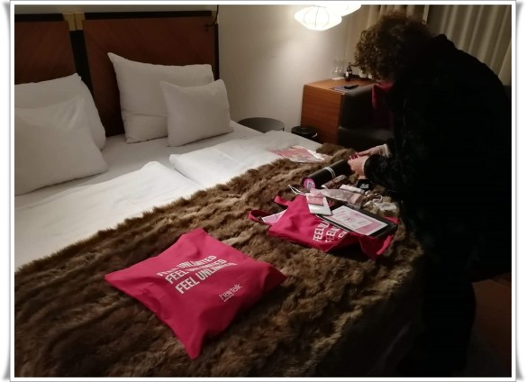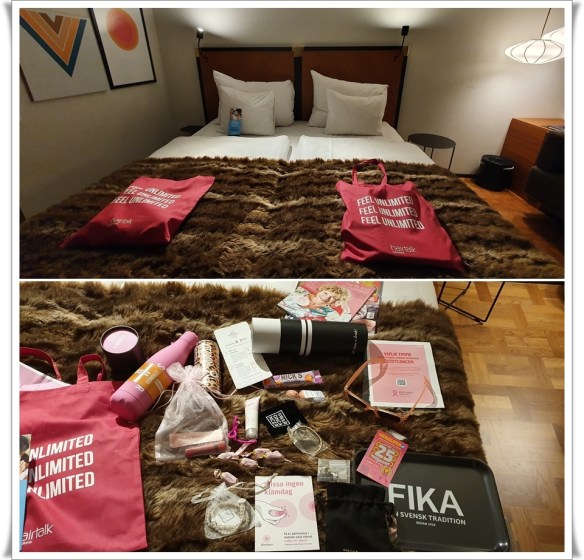 Vi checkade in och fatta lyckan när man inser att man fått goodiebags och det var verkligen inte vilka goodiebags som helst. Jag hällde ut allt innehåll innan jag fått av mig jackan trots att jag höll på att svettas ihjäl. Katta stod helt förundrad och tyckte det var årets moment när hon såg min glädje över en bag liksom 😅😅