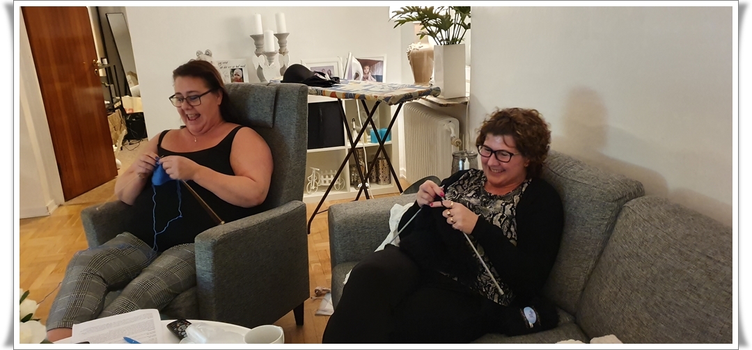 Jag tog med mig lilla stickväskan så vi kunde ha en minijunta 😁 Git stickar bebiskläder och jag en halsduk till Milla.