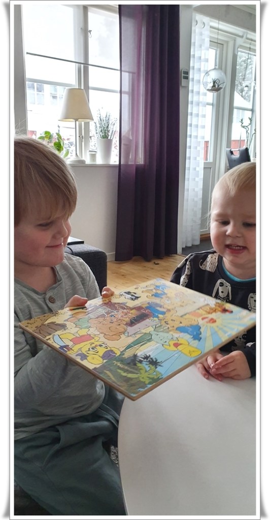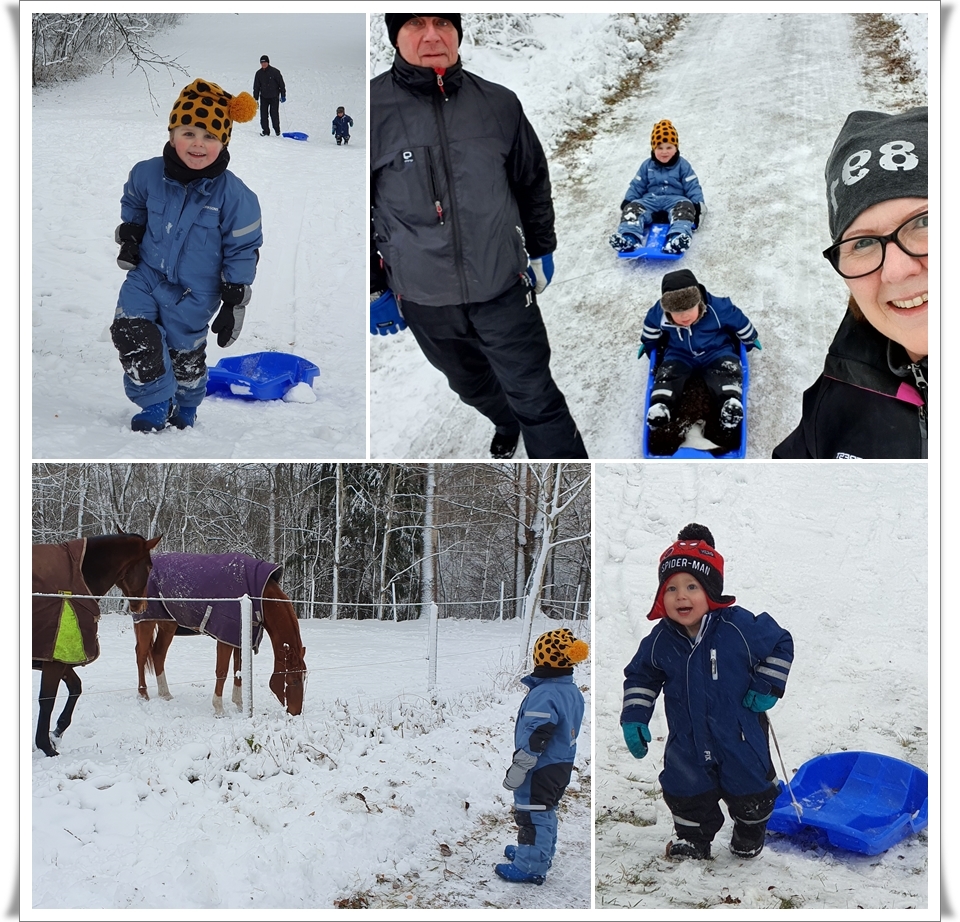 Vi har åkt pulka i backen, tycker fortfarande att det är lyx att ha backen alldeles utanför dörren. Vi har lagt pussel, ritat, tagit en pulkapromenad till hästarna. Handlat och ätit lördagsgodis, haft besök av Chrille, Milla & Soppis.