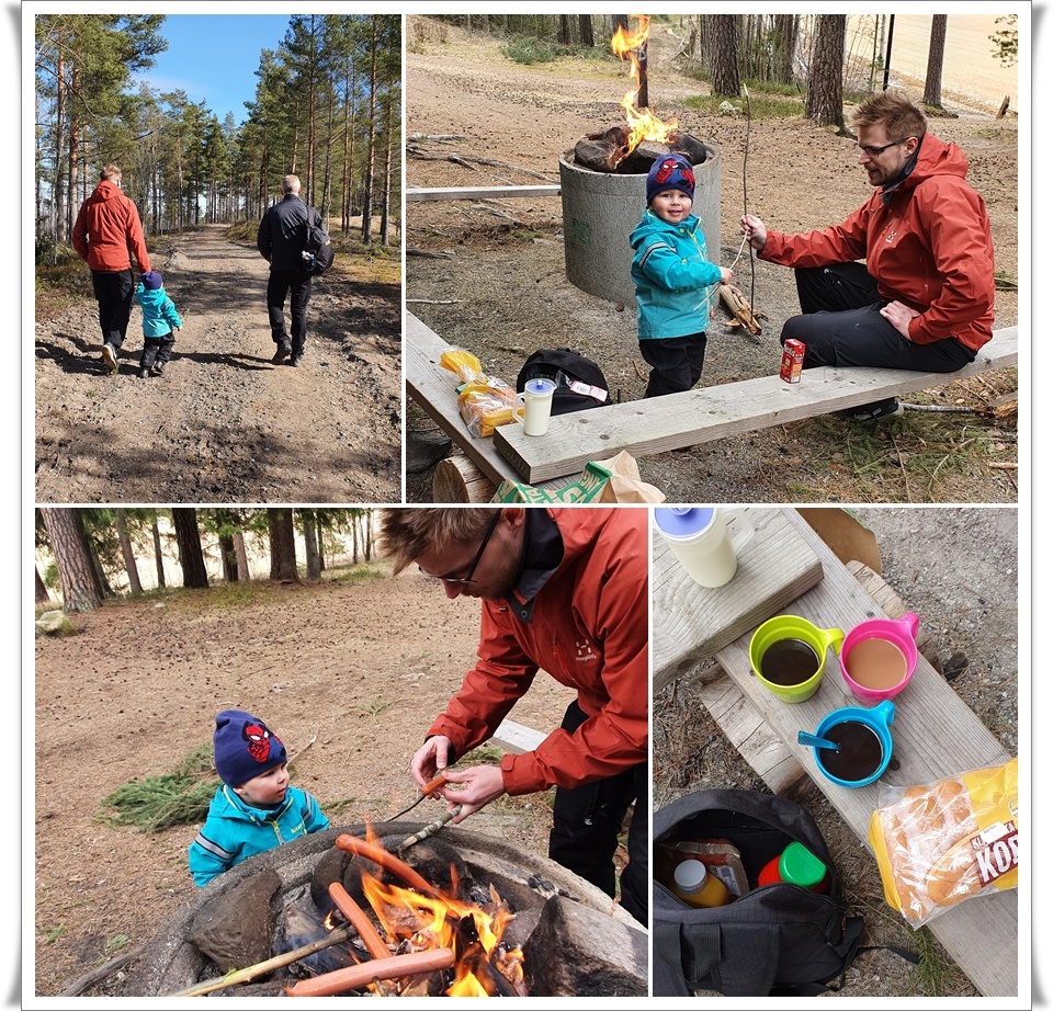 Idag kom Alex och Alve på besök och eftersom vi inte vill vara upp i varann så gick vi ner i skogen och grillade korv.