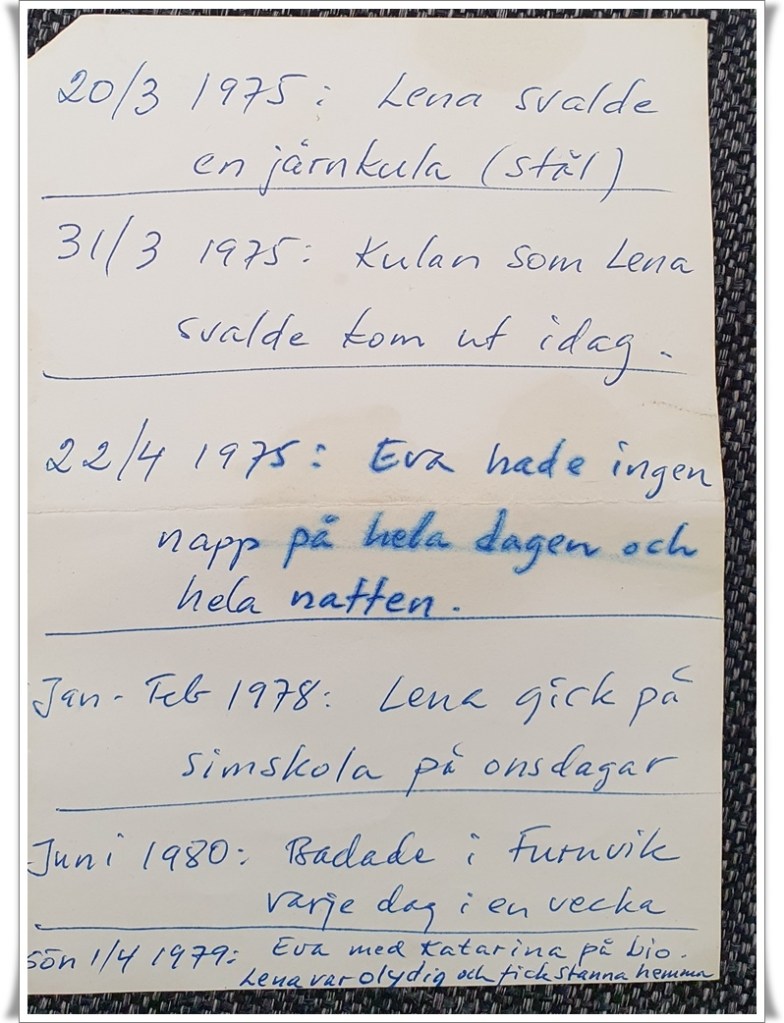 En av dom är denna lapp som mamma skrev när Lena och jag var små.