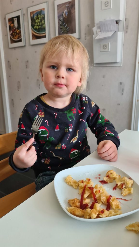 Vi åt våfflor till lunch och han konstaterade att det var våffeldagen hos oss. Vilken tur!