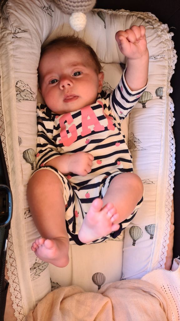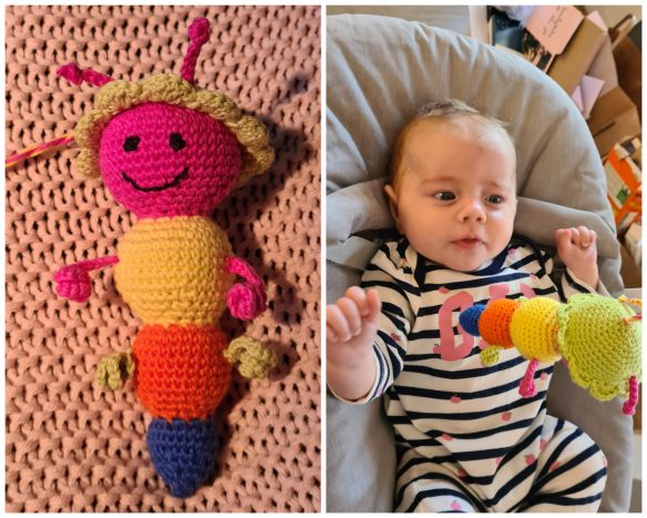 Jag har virkat en färgglad filur med rasselskallra i som jag tror hon kommer att gilla 😍