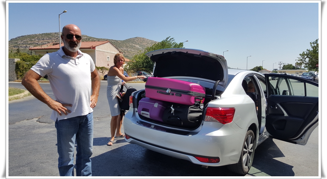 En något stressad taxichaufför kastade in våra väskor i bakluckan och nej dom fick inte plats men han drog ner luckan och satte dit ett spännband.