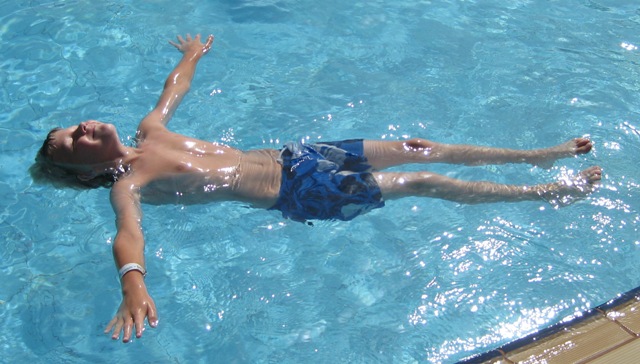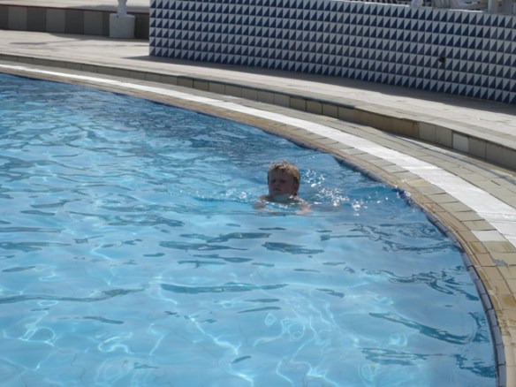 Jag följde med honom till poolen, han kastar sig i…. och simmar 😮