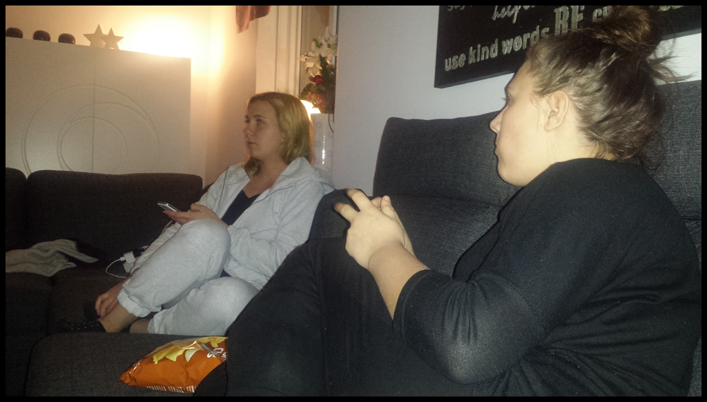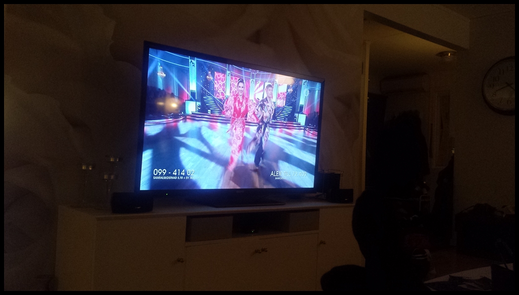 Malin, Evelina och jag tittar på Lets Dance och äter cheez starz.