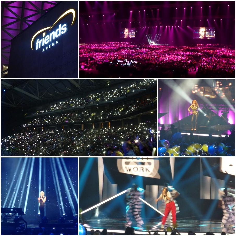 Vi tog pendeln till Solna. Smått förvirrade om vi skulle kliva på rätt tåg sprang vi på Maria, Petra, Emma och Moa. Vår förhoppning var att dom skulle vara mer rutinerade men nja, kanske inte så rutinerade. Vi kom rätt i alla fall och följde strömmen i vänsterfil till Friends Arena. Maria har långa ben så det gick undan vill jag lova. Var alldeles svettig när vi var framme 🙂