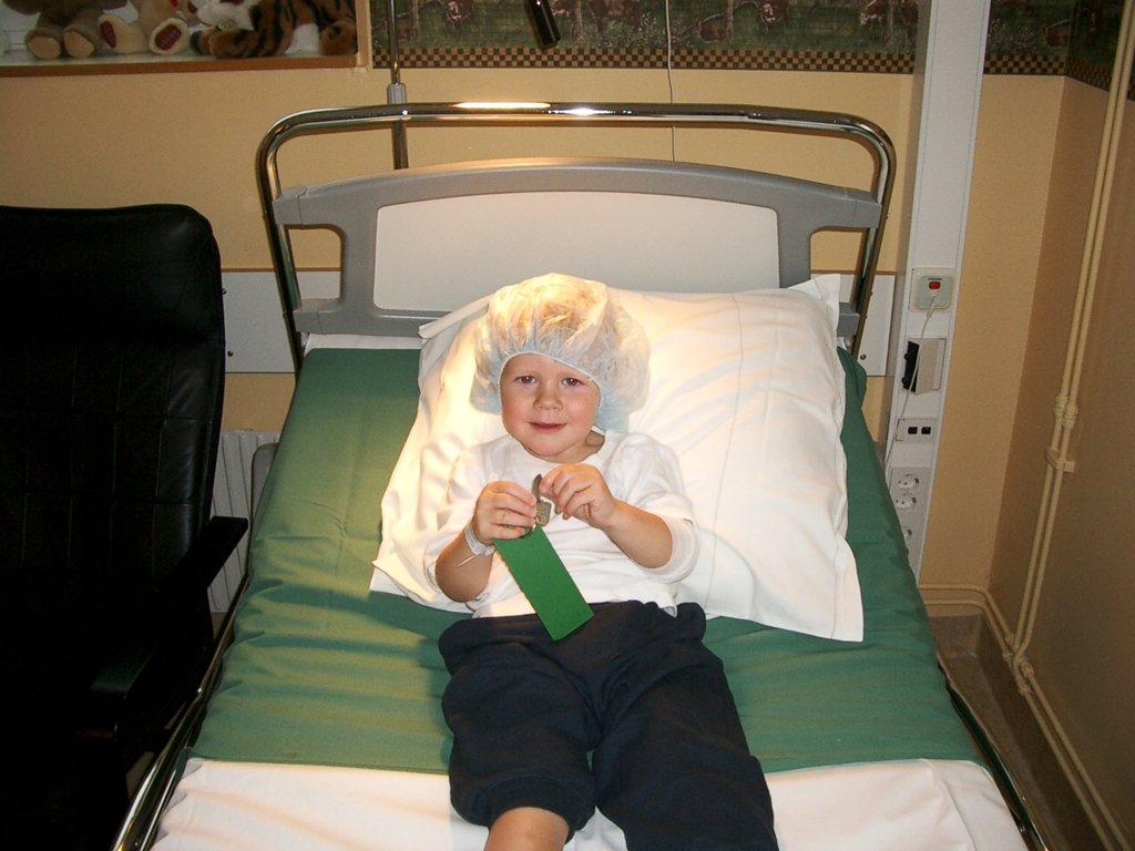 Uppe i ottan och på plats i Dagkirurgens nya fina lokaler 07:20. Både Malin och jag fick grymt snygga kläder. Mössan är bara bäst 😛